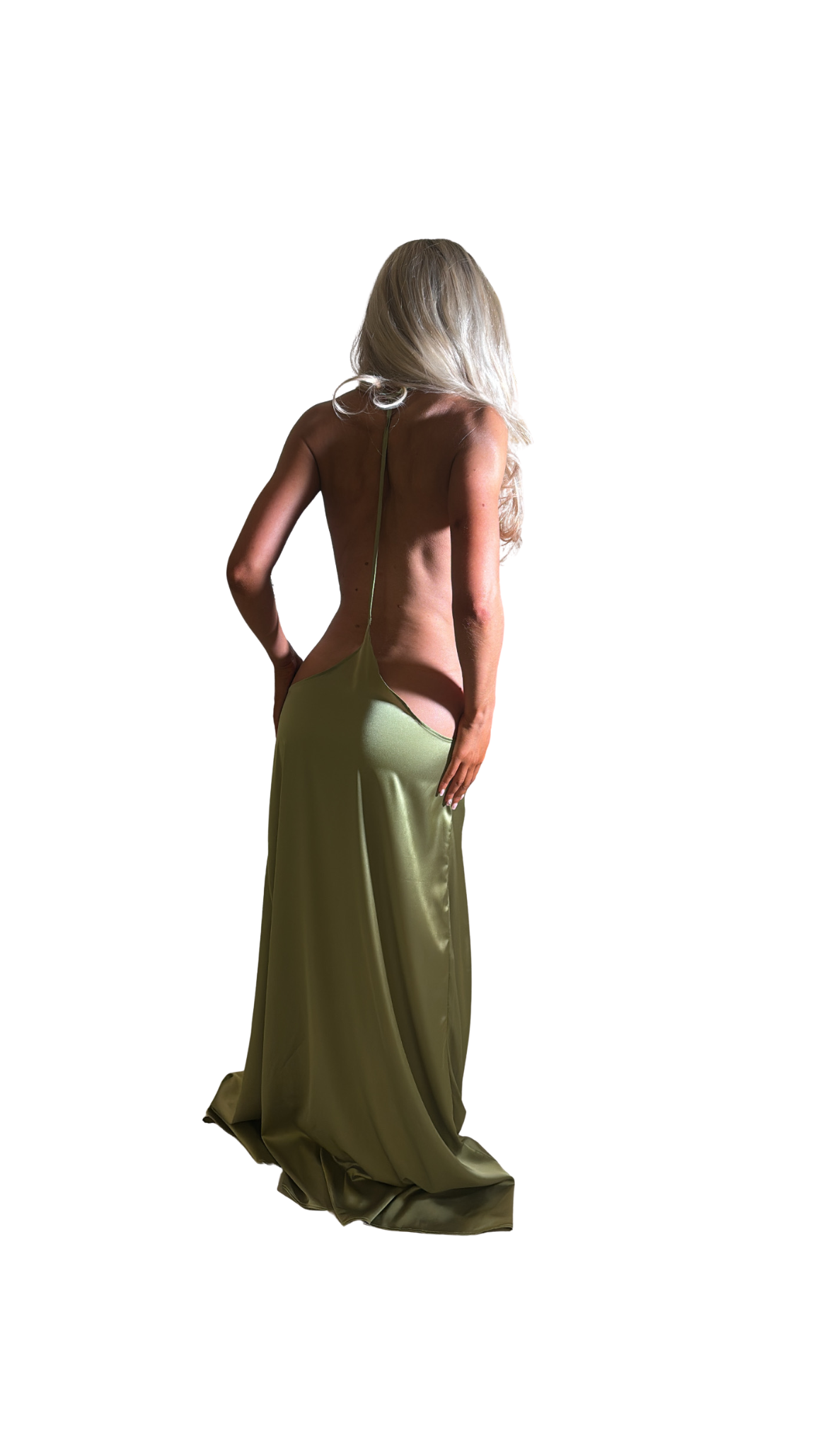 Luxurious, high-shine pistachio satin. A maxi dress with a plunging neckline, cinched elegantly at the waist with a gathered ring detail, with open sides and an ultra-low back . The halter-neck tie ensures a secure fit and accentuates your shoulders and back. Finished with a thigh-high front slit.
